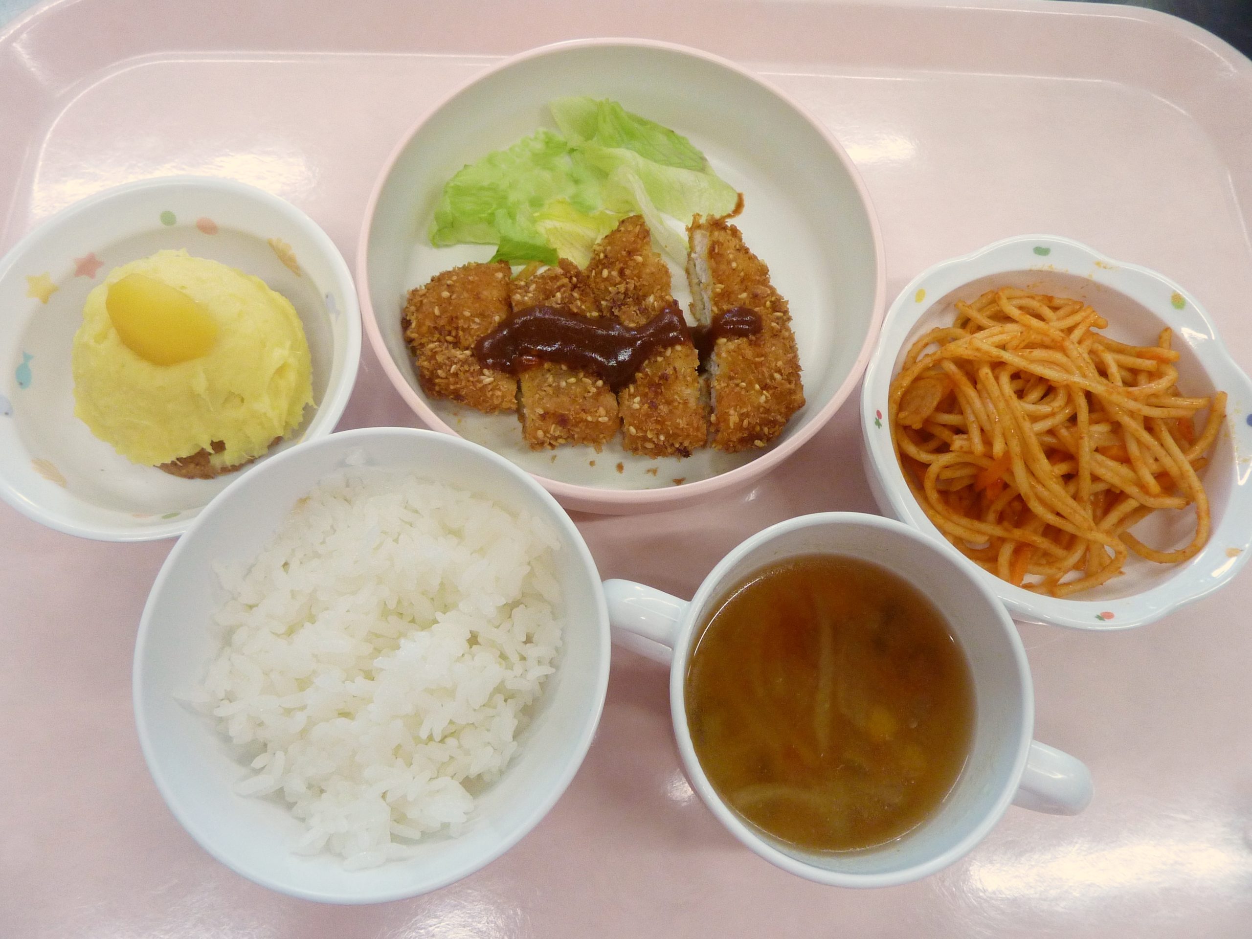 ごはん・とんかつ・レタス・ナポリタンスパゲティ・野菜スープ・さつま芋モンブラン