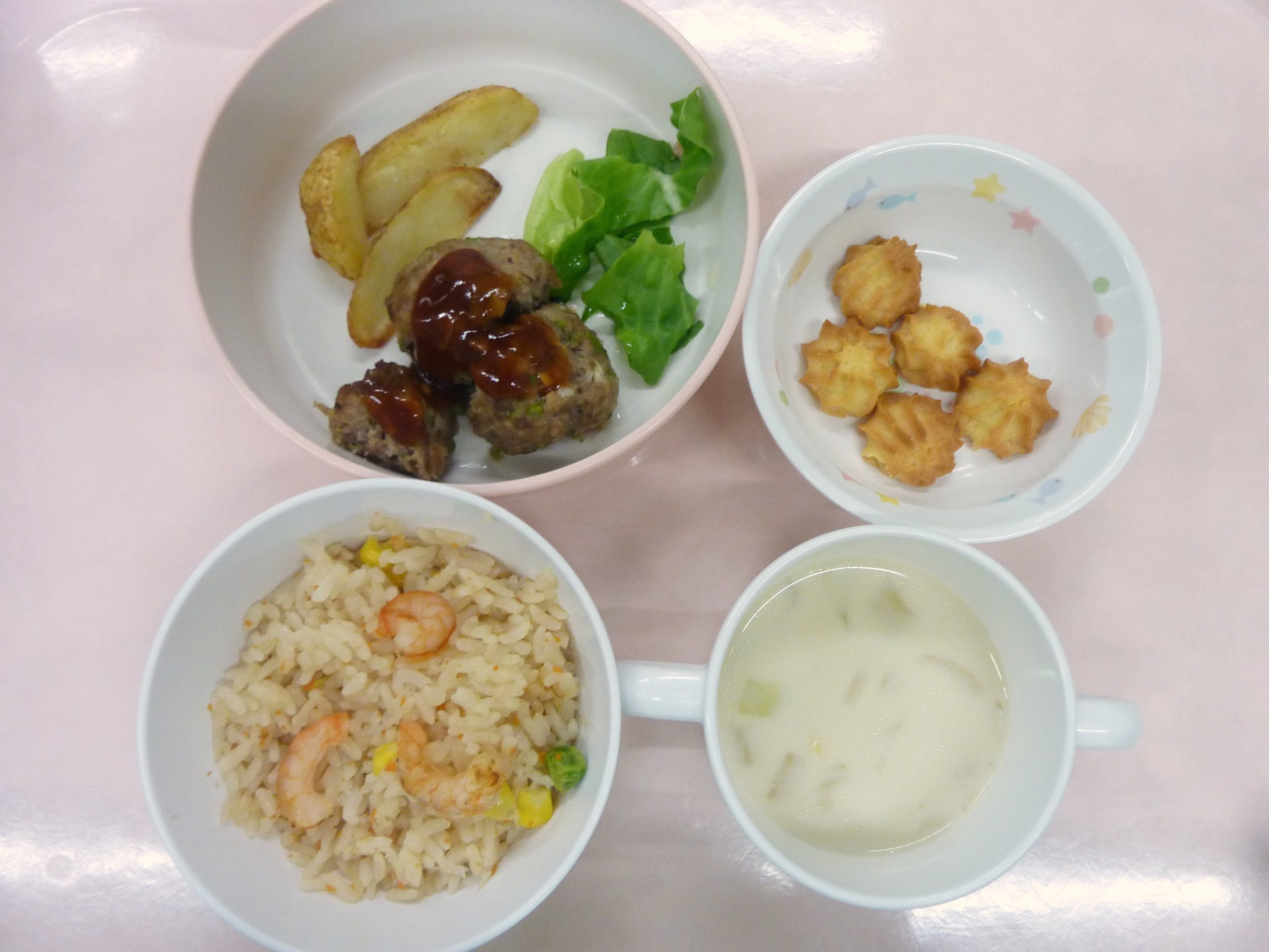 えびピラフ・ハンバーグ・ポテト・サラダ菜・野菜チャウダー・絞りだしクッキー