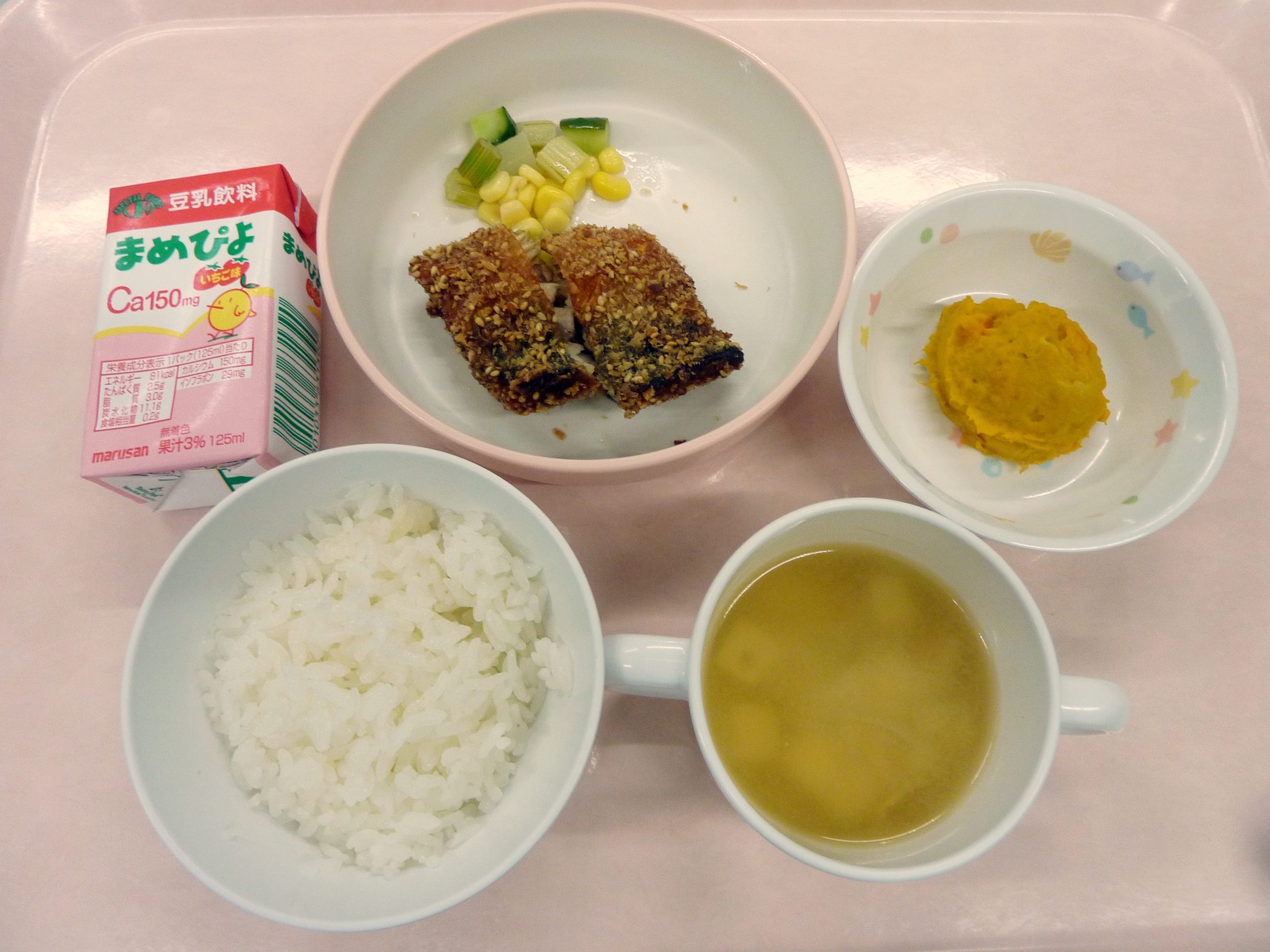 ごはん・サバのごま揚げ・野菜のマリネ・かぼちゃサラダ・みそ汁・まめぴよ(豆乳飲料)