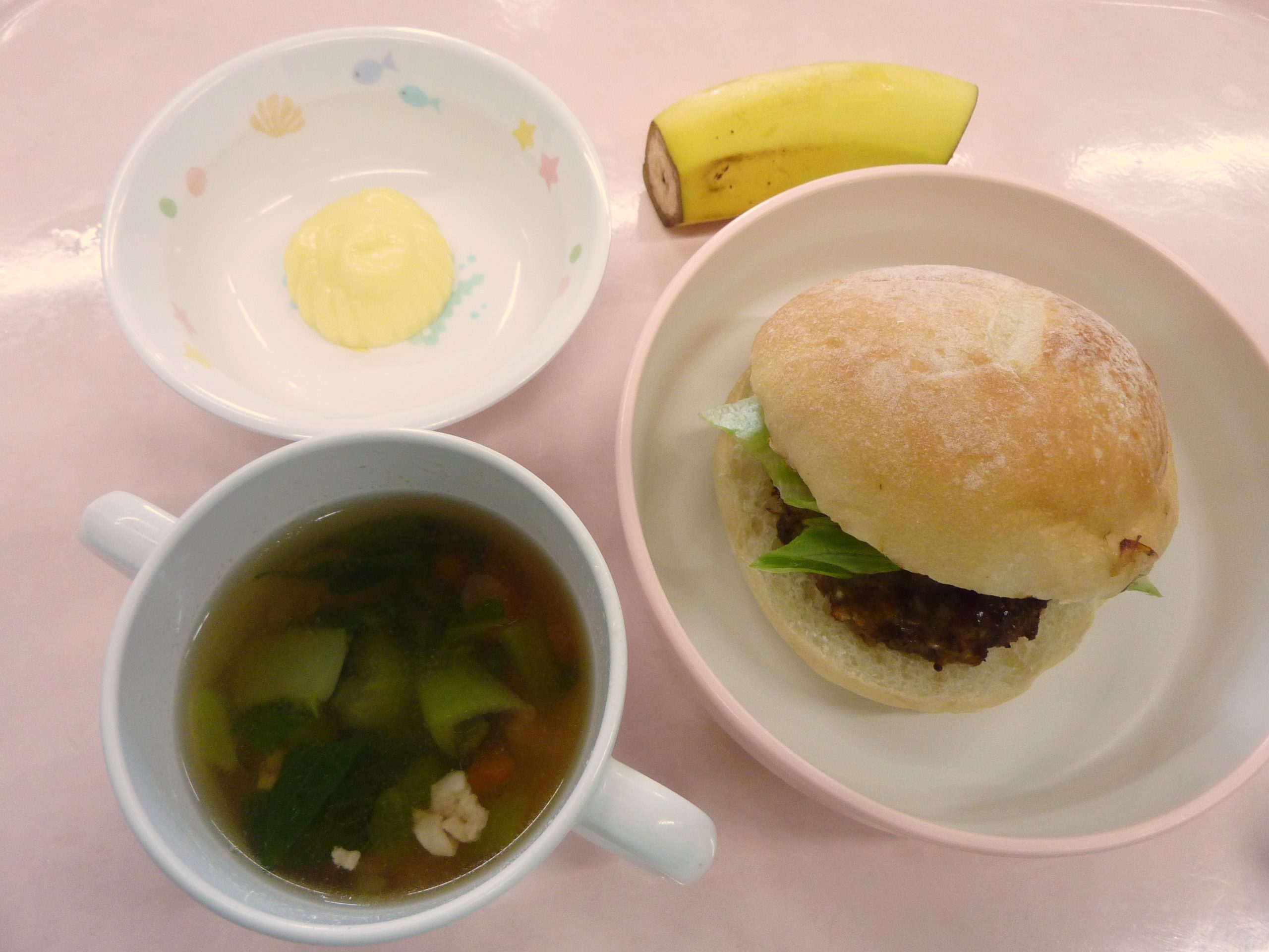 ハンバーグサンド・型抜きチーズ・鶏と野菜のスープ・バナナ