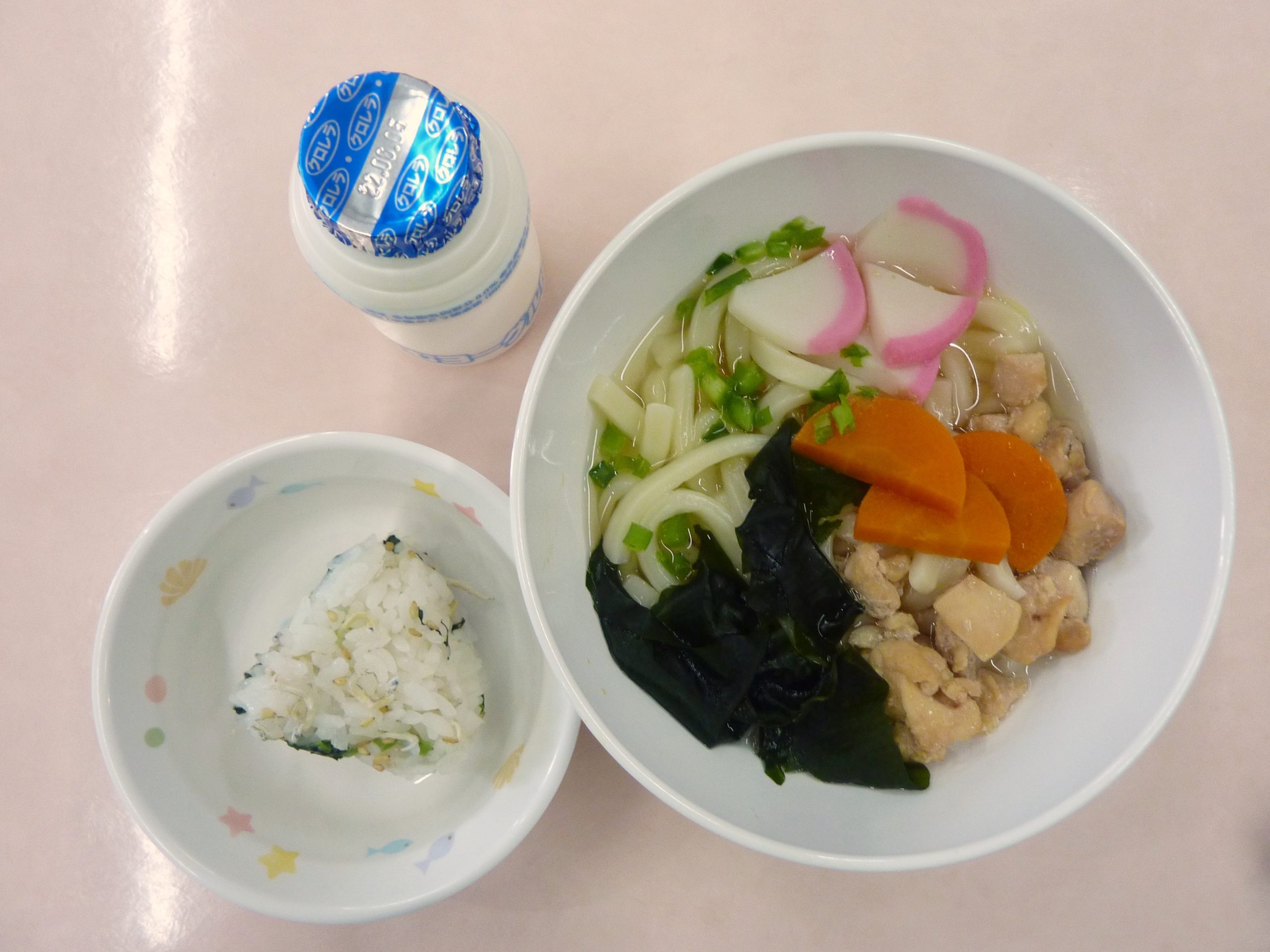 かしわうどん・じゃこと青菜のおにぎり・飲むヨーグルト