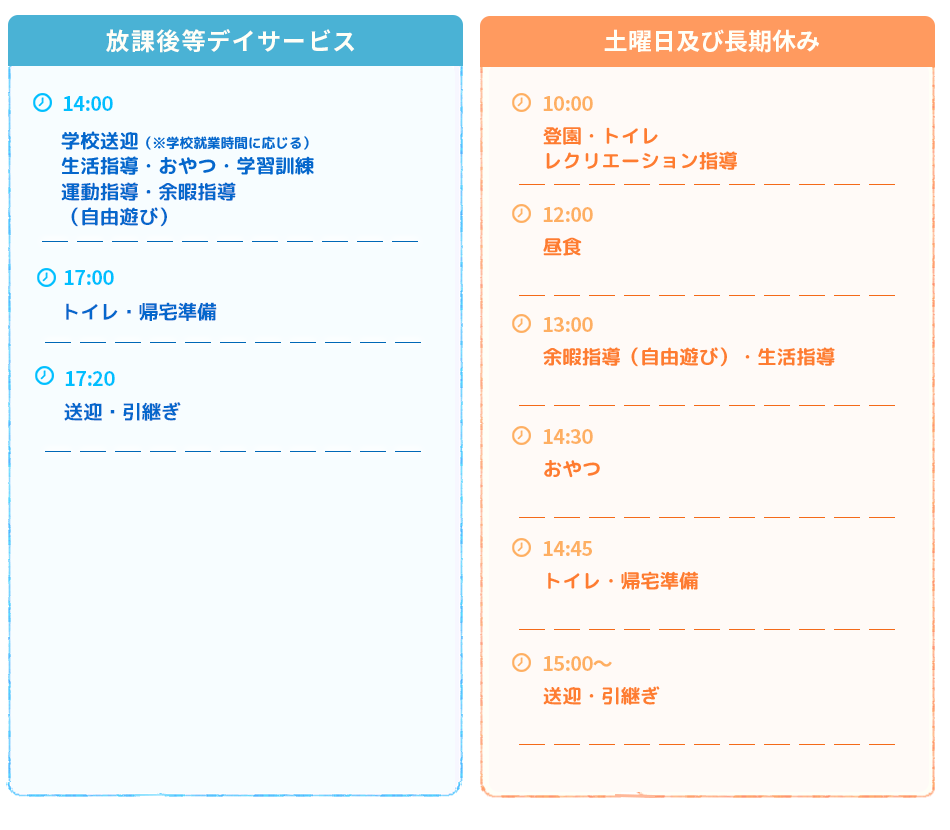・放課後等デイサービス:平日14:00~18:00/土曜日・長期休暇10:00~15:00