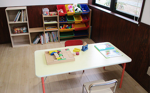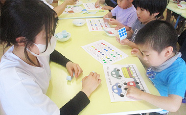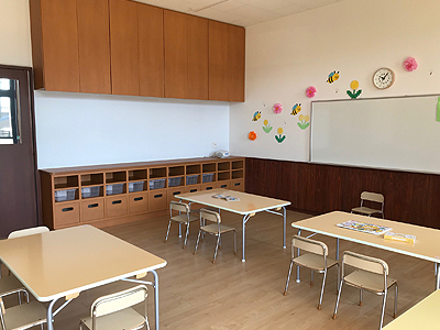 各クラスには、絵カードを用いた1日のスケジュール表の提示や個人ロッカーにそれぞれのマークを付ける等の環境設定を行い、視覚的に情報を収集できるよう工夫しています。課題は各クラスで分かれて行い、休憩時間には遊戯室や園庭で過ごすことで、課題と自由遊びの時間の切り替えを行っています。園舎の隣には公園があり、園外保育ではいつもと違った環境の中のびのびと過ごすことができます。