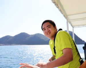 青空の下、ご家族に見送られながら船で大島へ出発しました。