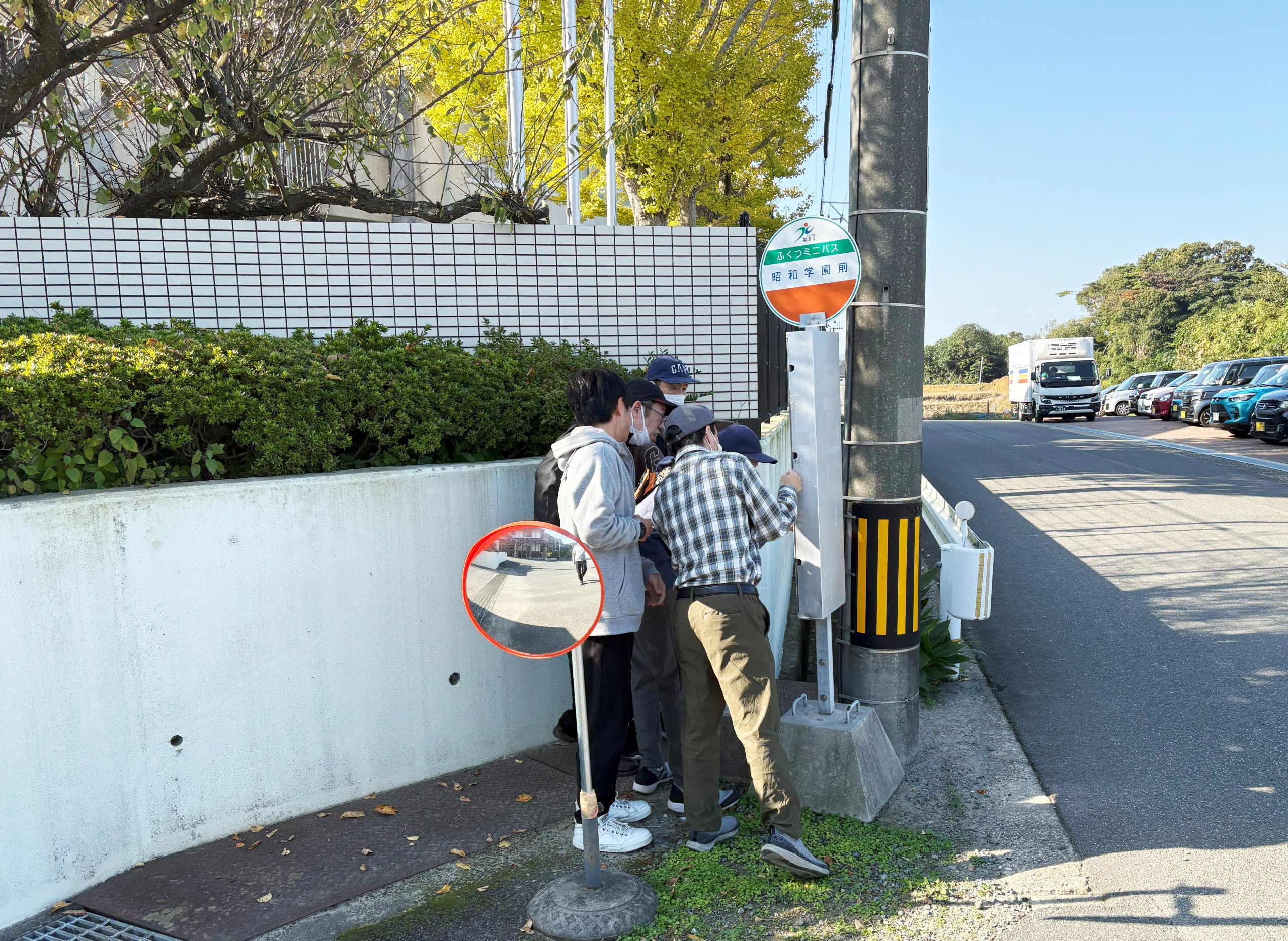 昭和学園前のバス停に複数の人影がありました。