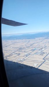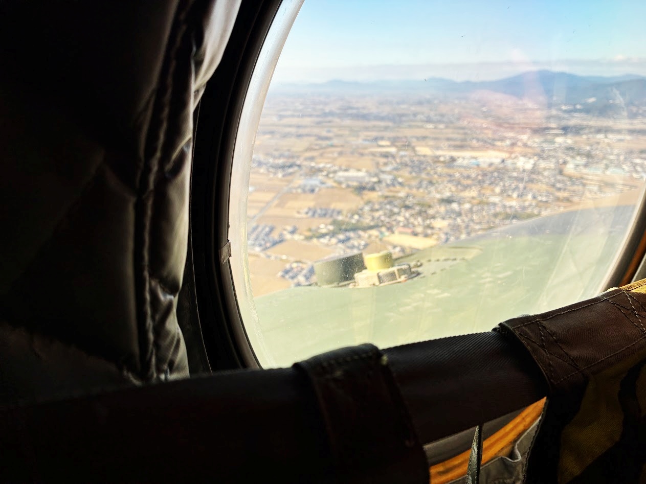 翼が回転している状況の中、機体後部から耳栓をして乗り込みました。