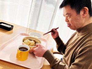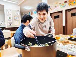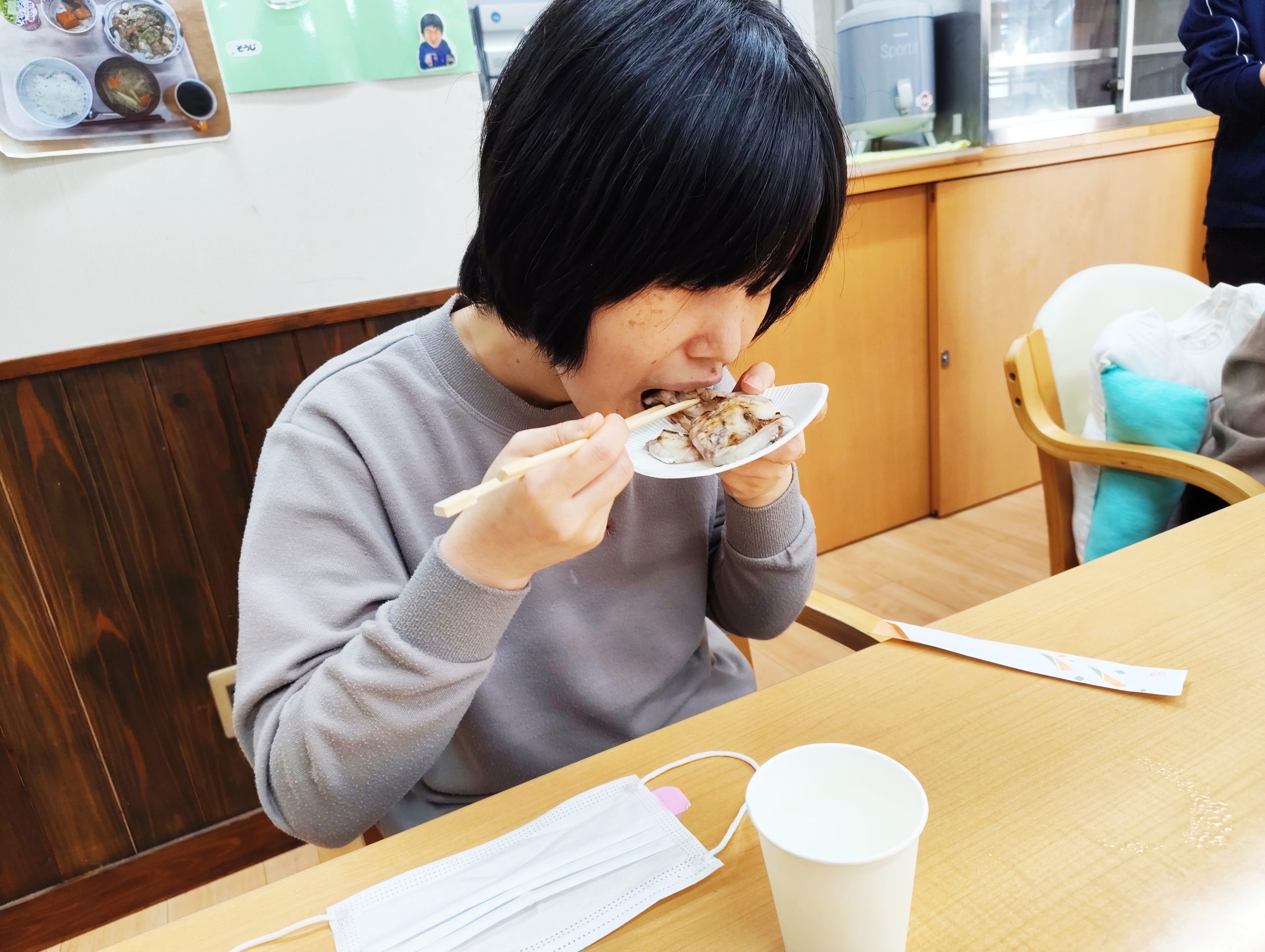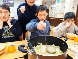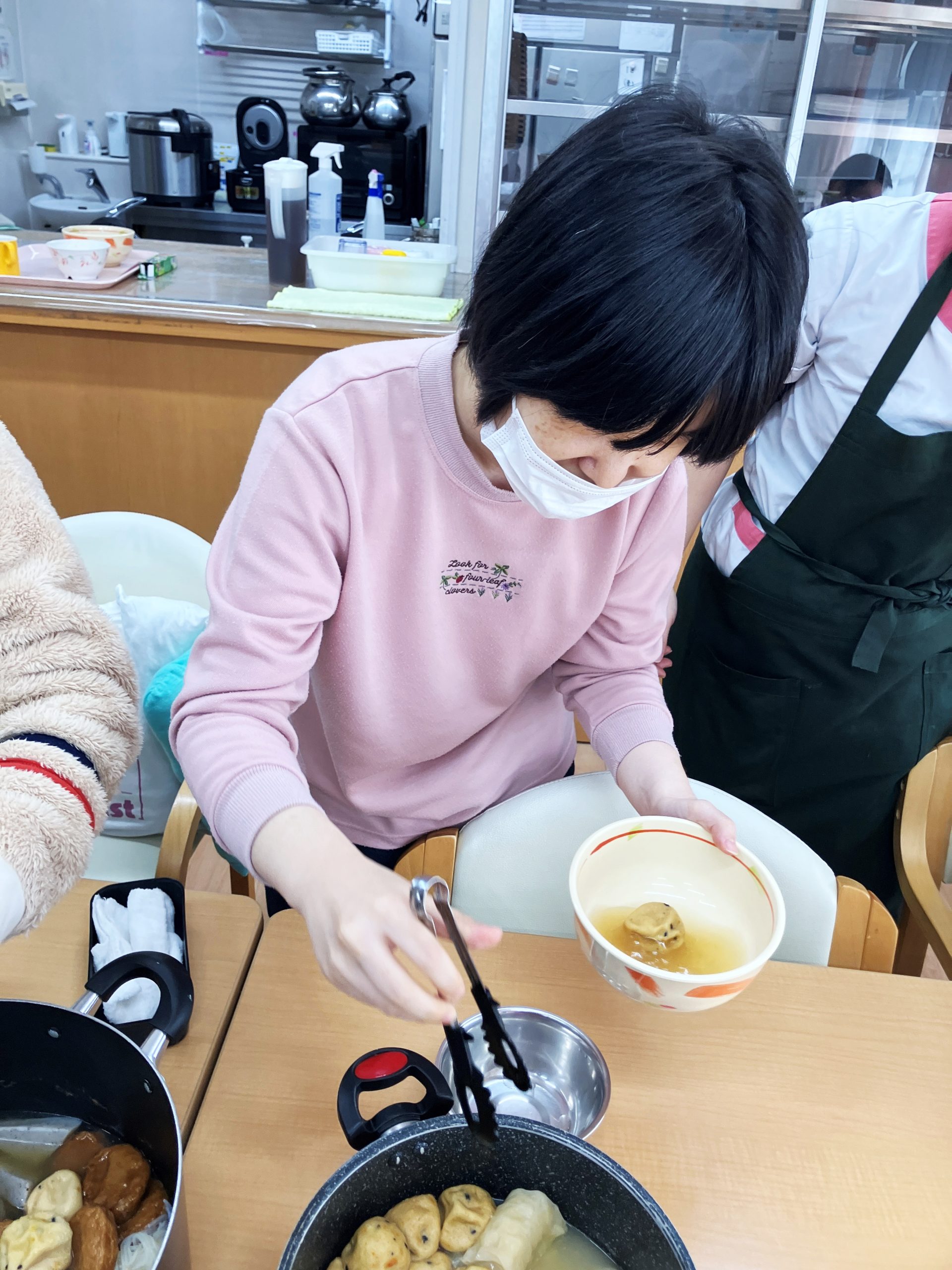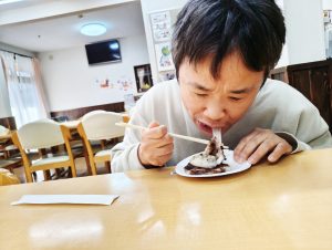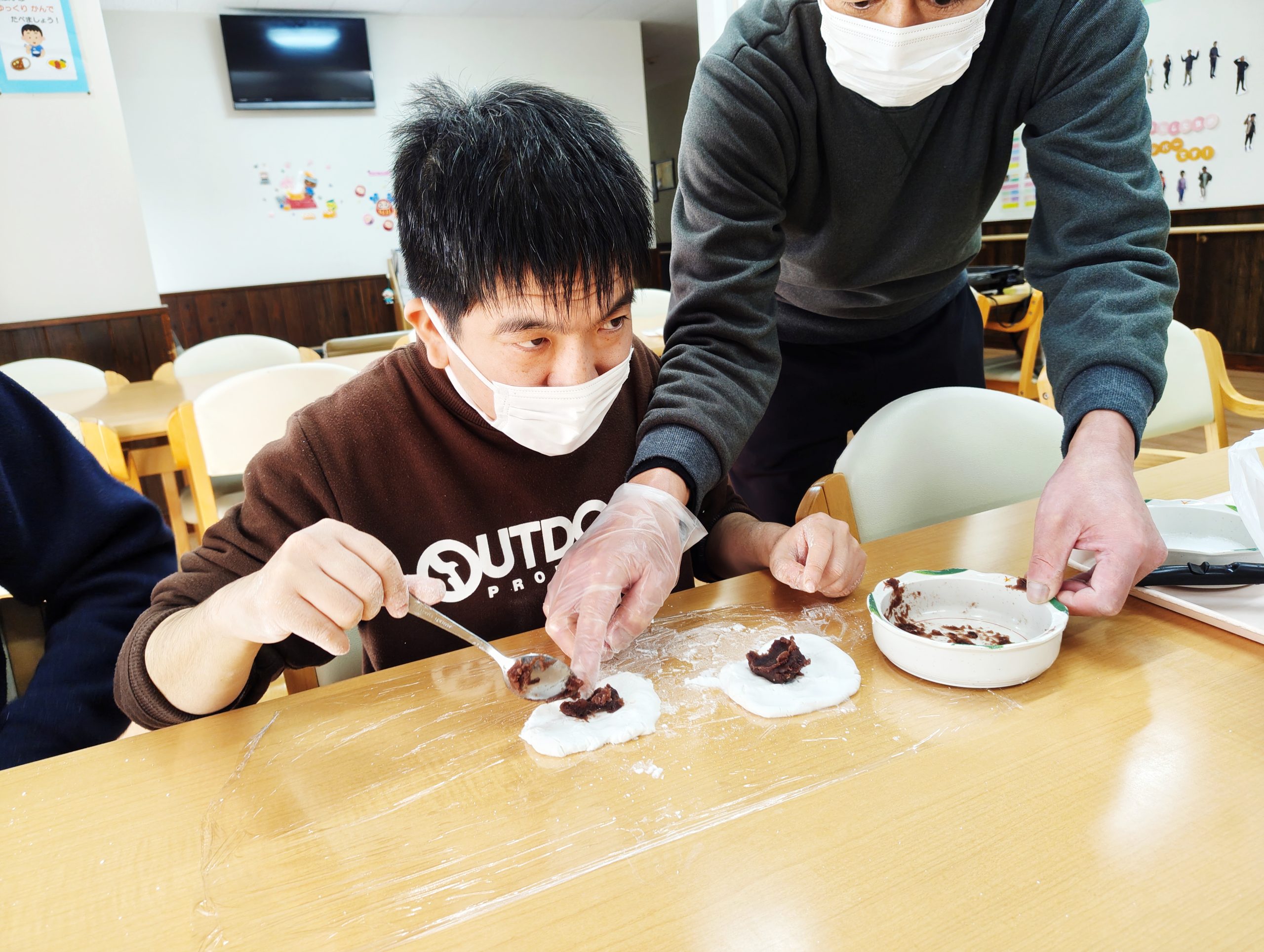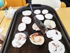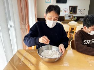 年末年始を安ら居で過ごす利用者のみんなが一足先に初詣気分を味わえるよう、大晦日のおやつとして、「松ヶ枝餅」をみんなで作って食べました!