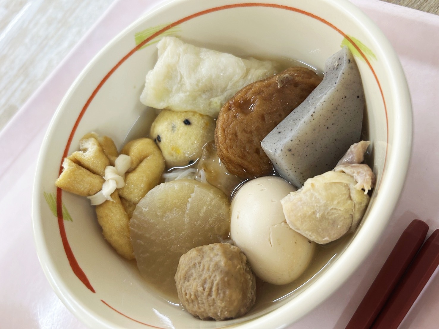 お品書きを見ながら、たまご、大根、もち巾着、がんもどき、ちくわ等々、色んな具材をお椀に盛り付けます。
