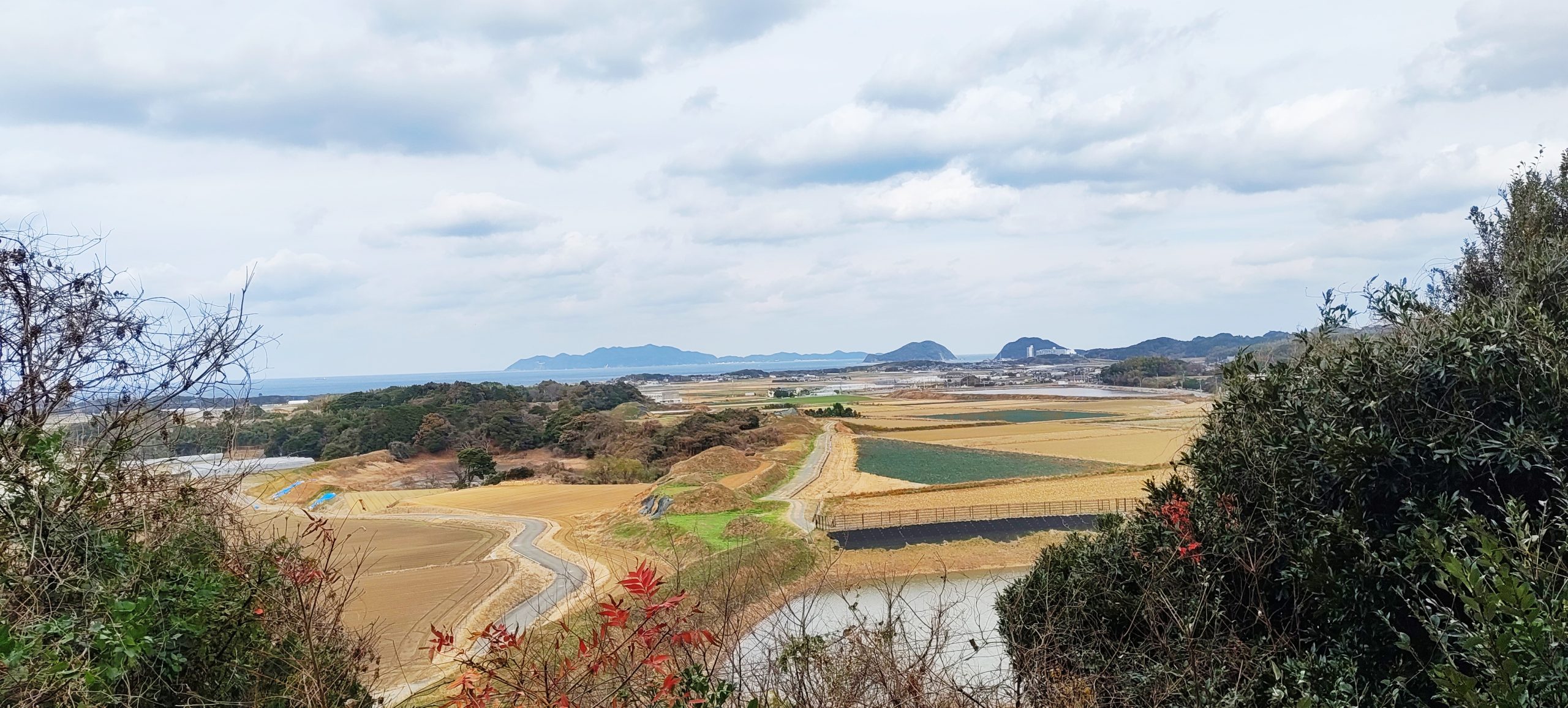 その場所は丘の上にあり、世界遺産である新原・奴山古墳群が一望できます。