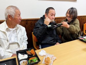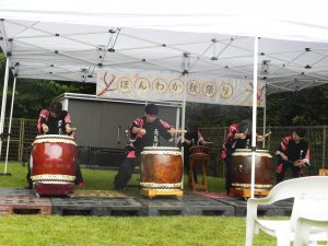 午前の部は、外部協力者の「元気鼓」による太鼓の演奏が行われ、利用者も太鼓の体験をさせていただきました。
