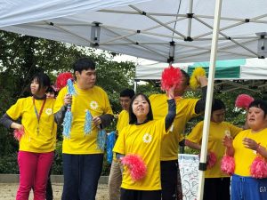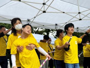 1日目の活動内容は、ペアのボランティアさんやチームのお友達と交流を深めるため、爆弾ゲームやフラフープリレーで対決をしたり、大きなテントに色塗り、自由画をして制作を行ったりしました。