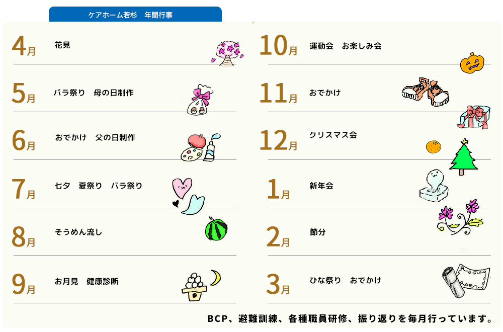 楽しくワクワクしながらも心穏やかに過ごすことができる場所にするべく、生活スタイルが安定した頃から「魅力アップ大作戦」として「カラオケ」「おやつバイキング」「ドライブ」「おでかけ」等、みんなが楽しめるイベントを徐々に増やし、実施しています。
